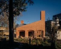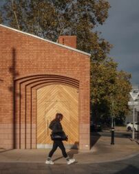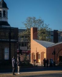 Um dem kleinen Gebäude Würde zu verleihen, habe man sich für eine Gestaltung mit traditioneller Ziegelfassade, geschwungenen Tür- und Fensterbögen sowie Türen aus Eichenholz entschieden. Die zwei Türme – der eine ragt knapp über zehn, der andere knapp unter neun Meter hoch auf – dienen der natürlichen Belüftung der Toiletten und der Caféküche. Zusammen mit den schräg abfallenden Dachflächen entsteht auf dem kleinen Haus eine Dachlandschaft, die sich auf die Türmchen, Wehrtürme und Zinnen des Royal Arsenal bezieht – einer ehemaligen Waffenfabrik, deren weitläufiges Gelände auf der gegenüberliegenden Straßenseite beginnt.