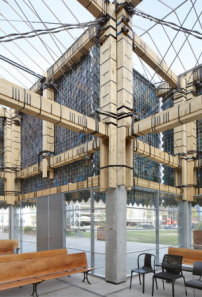 Die Glasfassade im Erdgeschoss war ein Überbleibsel aus der Sanierung der BOL.com-Zentrale und wurde nach der Dutch Design Week für neue Büroräume genutzt. Die Basis der Pavillon-Konstruktion bildeten 12 Betonpfeiler und 19 Holzrahmen, entworfen in Zusammenarbeit mit Arup. Die Rahmen bestanden aus Holzbalken, die mit Stahlbändern zusammengehalten wurden. Betonpfähle und -zargen waren mit 350 Spanngurten verbunden und schufen so eine acht Meter hohe Grundstruktur für das 250 Quadratmeter große Gebäude. (as)