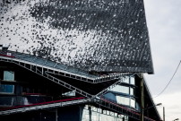 Das alles findet sich hinter einer Fassade, die den Charme pseudo-technologischer Architektur der 90er versprüht. Darüber stülpt sich ein Haufen zusammengeschobener Dachflächen, die ein unruhiges Muster überzieht. Von weitem erinnert die Dachhaut an einen Schwarm aufgeschreckter weißer Tauben im grauen Himmel. In Bernhard Tschumis Parc de la Villette gelegen kann sich der Neubau auch als eine Hommage an den Dekonstruktivismus lesen lassen.