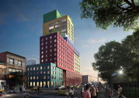 MVRDV zeigen sich jedoch zuversichtlich, mit dem Projekt ein Leuchtfeuer für respektvolle Stadtentwicklung zu installieren. Seine Kleinteiligkeit nehme dem Turm die Brachialität, der Veranstaltungsraum in der blauen Box fülle als Hochzeitsvenue mit spektakulärem Blick auf den Harlem River von der Dachterasse eine lange klaffende Lücke im Bezirk, und das Übernachtungsangebot richte sich vornehmlich an die Klientel von in der Nachbarschaft existierenden Institutionen. Die Fertigstellung des Radio Tower & Hotel ist für 2021 geplant. (kms)