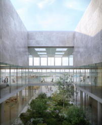 Die Visualisierungen zeigen darum klare Formen und viel polierten Naturstein, schwarz–stählernes Detailing, das auf dunkles Holz trifft und, als weitere Referenz, den einen oder anderen begrünten Patio – ganz so, wie man es von einem entfernt an die Mies-Moderne angelehnten Terminalbau erwartet, wie es aber durchaus auch für die Arbeit von KAAN typisch ist. Von dieser konsequenten Haltung weicht nur die weitgespannte Dachkonstruktion mit ihrem quadratisch-opak anmutenden Deckenraster ab. Diese verspricht zwar nicht nur viel Licht, sondern auch eine hohe funktionale Vielseitigkeit, ihre Wirkung ist aber im Vergleich zur übrigen Architektur irgendwie zu plump. Etwas Zeit für eventuelle Überarbeitungen ist aber noch, denn das 100.000 Quadratmeter große Terminal soll erst 2023 fertiggestellt werden. (sb)