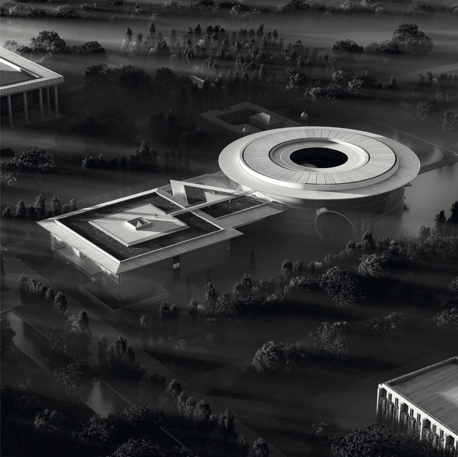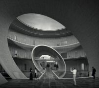 Die bisher veröffentlichten Renderings und Skizzen zeigen das Museum, das auch eine Bibliothek beheimaten soll, als eher kontextlos gesetzte Abfolge geometrischer Grundformen. Das lässt sich mit etwas gutem Willen als puristischer Entwurf nach Handschrift des japanischen Minimalismus-Meisters lesen. Die skizzierten Situationen wirken jedoch wie Zitate bereits existierender Kulturgebäude und lassen wenig von Andos räumlicher Herangehensweise erkennen. Die Innenraumgestaltung übernehmen Atelier Brückner aus Stuttgart, die auch besagten Osaka-Pavillon realisiert haben.