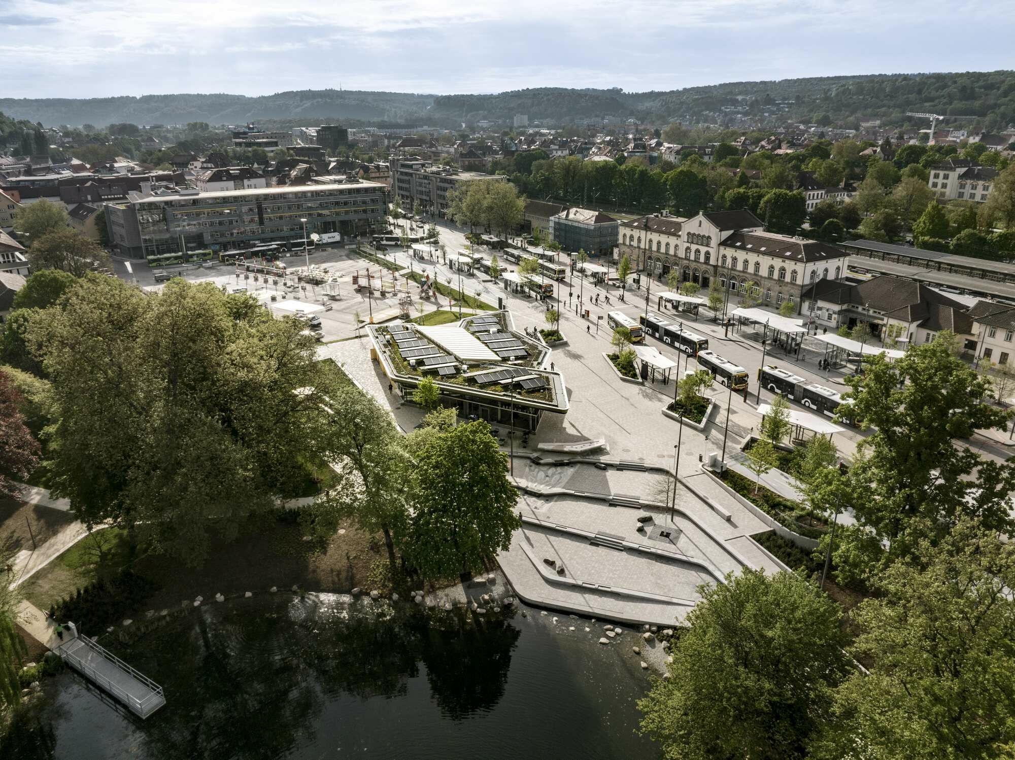 Die Radstation bildet ein räumliches Verbindungselement zwischen den beiden Bahnhöfen und dem Anlagensee. Letzterer ist von einem Park mit altem Baumbestand umgeben. An diesen knüpft der Baukörper unmittelbar an, indem er mit seiner Form die Bewegungslinien der Freiraumkanten aufnimmt. So entstand eine dynamische Kurvung, die durch das auskragende Dach noch betont wird. Die am Europaplatz liegende Einfahrt für die Radfahrenden teilt den Bau in zwei miteinander verzahnte Volumen. Große Glasflächen lassen ihn luftig und durchlässig wirken, die vorgelagerte Terrasse mit Außengastronomie ist in Richtung See ausgerichtet.