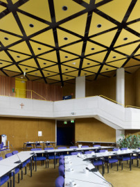 Wer heute das Haus besucht, kann vieles von diesen Gedanken noch im Original erleben: eine offene, multifunktionale Treppenhalle im Erdgeschoss samt publikumsstarken Einrichtungen (wie das Standesamt), im Obergeschoss repräsentative Büros für die Stadtspitze, im Verwaltungsbereich auf zwei Ebenen Großräume mit Arbeitsplätzen für insgesamt 145 Mitarbeiter. Ein zweigeschossiger Sitzungssaal mit Zuschauertribüne und eine Cafeteria liegen obenauf. Im Wettbewerb waren sogar eine Stadthalle, eine Polizeistation und ein Brückenrestaurant über den nahen Fluss als Erweiterungsoptionen angedacht. Der Spirit des Gebäudes ist noch immer spürbar – auch die bauzeitliche Innenausstattung sowie Möbel sind im Wesentlichen erhalten.
