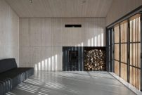 Ein fließendes, höhlenartiges Raumgefühl suchten die Architekten mit einer einheitlichen Innenraumgestaltung zu erreichen: Die Holzeinbauten sind mit einer weißen Ölpolitur behandelt, und der Boden ist aus sandfarbenem Zementestrich gegossen, der in Abstimmung mit dem Sand der Seestrands ausgesucht worden war. Ein bereits vorhandener Steg führt direkt vom Haus über den moorigen Grund dorthin. (lr)