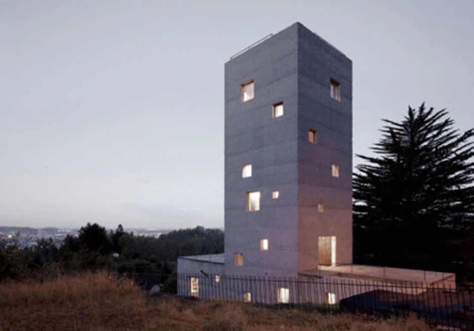 Pezo von Ellrichhausens Bau liegt am Waldrand und heißt offiziell eigentlich Überhaus – ein Hinweis auf seine erhöhte Lage, aber auch, wie könnte es anders sein, auf Nietzsches Übermensch. Die Architekt*innen selbst nennen ihr Projekt mit Verweis auf die Nutzung jedoch einfach nur Rest. Das brutalistisch anmutende Volumen wird durch seine massiven Stützen und die dazwischen eingespannte Betonplatte bestimmt. Scheinbar schwebend hängt darunter der Glaskörper, in dem das Restaurant mit 100 Plätzen und zwei Terrassen an sich gegenüberliegenden Eckpunkten untergebracht ist. Vier der Stützen werden von Aufzügen belegt, zum Teil befinden sich hier außerdem Lagerräume oder Toiletten.