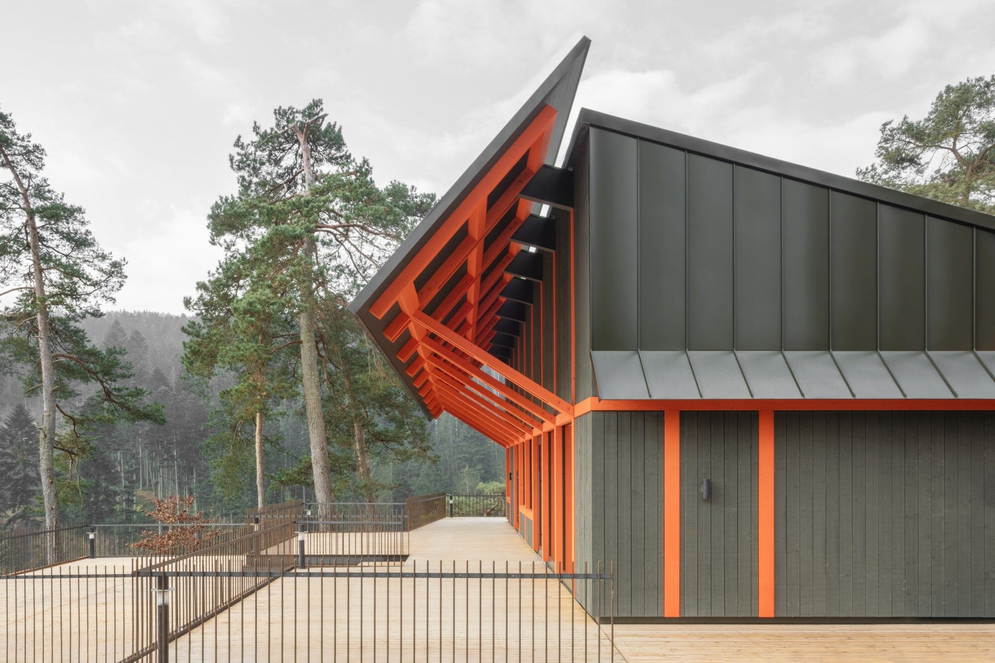 Viechtach ist eine Kleinstadt im Bayerischen Wald. Von hier aus liegt Budweis in Tschechien näher als nach München oder Nürnberg. Gut also, dass es mit dem Höllensteinsee im Nordwesten des Stadtgebiets bereits seit rund 100 Jahren eine landschaftliche Attraktion gibt: Mittels einer Talsperre aufgestaut, windet sich der Fluss Schwarzer Regen als dunkel spiegelnde Wasserfläche durch dichte Wälder. Der historische Kraftwerksbau erzeugt bis heute Strom. Errichtet wurde die Anlage ursprünglich von der Stadt Straubing, deren Stadtwerke sie bis heute betreiben. Schon in der Vergangenheit gab es hier eine Ausflugsgaststätte. Diese wurde nun durch das neue Gebäude ersetzt.