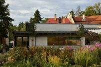 Am nordöstlichen Rand des Gartens öffnet eine architektonische Intervention von matěj šebek architekti das Gelände zur Straße. Der Neubau mit einer Bruttogrundfläche von 80 Quadratmetern ersetzt ein baufälliges Lager- und Gewächshaus. Er steht auf einem leichten Betonsockel, der gleichzeitig eine Rampe ausbildet, die als direkter Zugang zum Garten dient. Grundriss und Konstruktion schließen an die historische Umfassungsmauer an. Das flache, auskragende Gründach gewährleistet sommerlichen Wärmeschutz und fügt das Gebäude harmonisch in die terrassierte Umgebung ein.