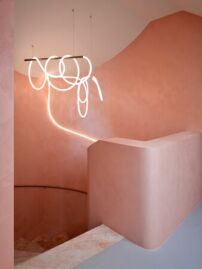 15 Wohnungen sind im Gebäude untergebracht, ihre Größen variieren zwischen 32 und 71 Quadratmetern. Für Interessierte: Fünf davon stehen noch zum Verkauf – zum Preisen zwischen umgerechnet 370.000 und 630.000 Euro. Drei Einheiten befinden sich im Untergeschoss und werden lediglich hofseitig belichtet. Erschlossen werden die Geschosse über eine mittig platzierte U-förmige Treppe, die einschließlich des Flurs in Lachsrosa gefärbt ist.