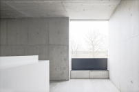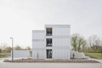 Die schlichte Form- und Farbgebung des Neubaus erinnert ein wenig an die vor Kurzem realisierte Hochschulerweiterung der Architekten in Stuttgart. In Niederstetten setzten sie den Baukörper „orthogonal zum Höhenverlauf“ des „campusartigen“ Kasernengeländes und dabei parallel zur umliegenden Bebauung. Der Bestand scheint auch als Grundlage für Proportion und Organisation des 3-geschossigen Neubaus gedient zu haben. Der Riegel ist zweibündig und „wird durch einen zentral gelegenen Versorgungs- und Erschließungskern aus Sichtbeton zoniert“. Das Untergeschoss ist zur Hälfte eingegraben und beinhaltet unter anderem Technikräume. Flieger- und Ambulanzbereich liegen im Erdgeschoss. Büroräume und eine „abgeschlossene Zahnarztpraxis zur Versorgung der Soldaten innerhalb der Liegenschaft“ befinden sich im Obergeschoss.