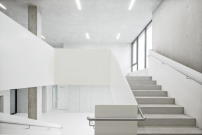 Der Massivbau mit tragenden Flur- und Außenwänden in Mauerwerksbauweise wirkt funktional und in der Gestaltung streng reduziert auf das, „was wirklich zählt“. Fenster und Aluminiumelemente folgen dem Fassadenraster mit vertikalen Fugen im Abstand von 1,25 Metern. Horizontale Bänder aus Sichtbeton-Fertigteilleisten markieren die Geschosse. Im Inneren trifft Sichtbeton auf weiße Wandflächen sowie Kautschuk-, Linoleum- und Kunststeinböden. Ein Latex-Dispersionsanstrich macht die Oberflächen abwaschbar, Trockenbau-Innenwände sollen für größtmögliche Flexibilität sorgen. (dd)