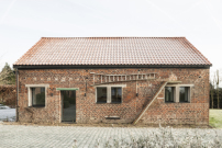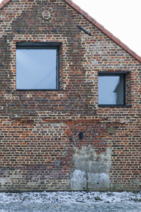 Das neue innere Volumen, das sich der Form der alten Scheune anpasst, verhindert nicht nur den Kontakt mit den in Boden oder Wänden vorhandenen Säuren, sondern optimiert auch den Energieverbrauch des Hauses. Die innere Schutzhülle ist aus Beton, und erinnert damit an die Arbeiten von Peter Haimerl, der in seinen Projekten Birg mich Cilli oder Schusterbauernhaus ebenfalls Kuben aus Sichtbeton in alte Bauernhäuser einfügte. Trotz aller Haus-in-Haus-Gedanken sanierte das Büro, das 2008 vom Italiener Guiseppe Farris gegründet wurde und 2014 mit einem 80 Meter hohen Wohnhochhaus in Antwerpen Erfolge feierte, die Bestandsfassade und fügte zusätzliche Öffnungen in die pittoreske Backsteinhülle ein.