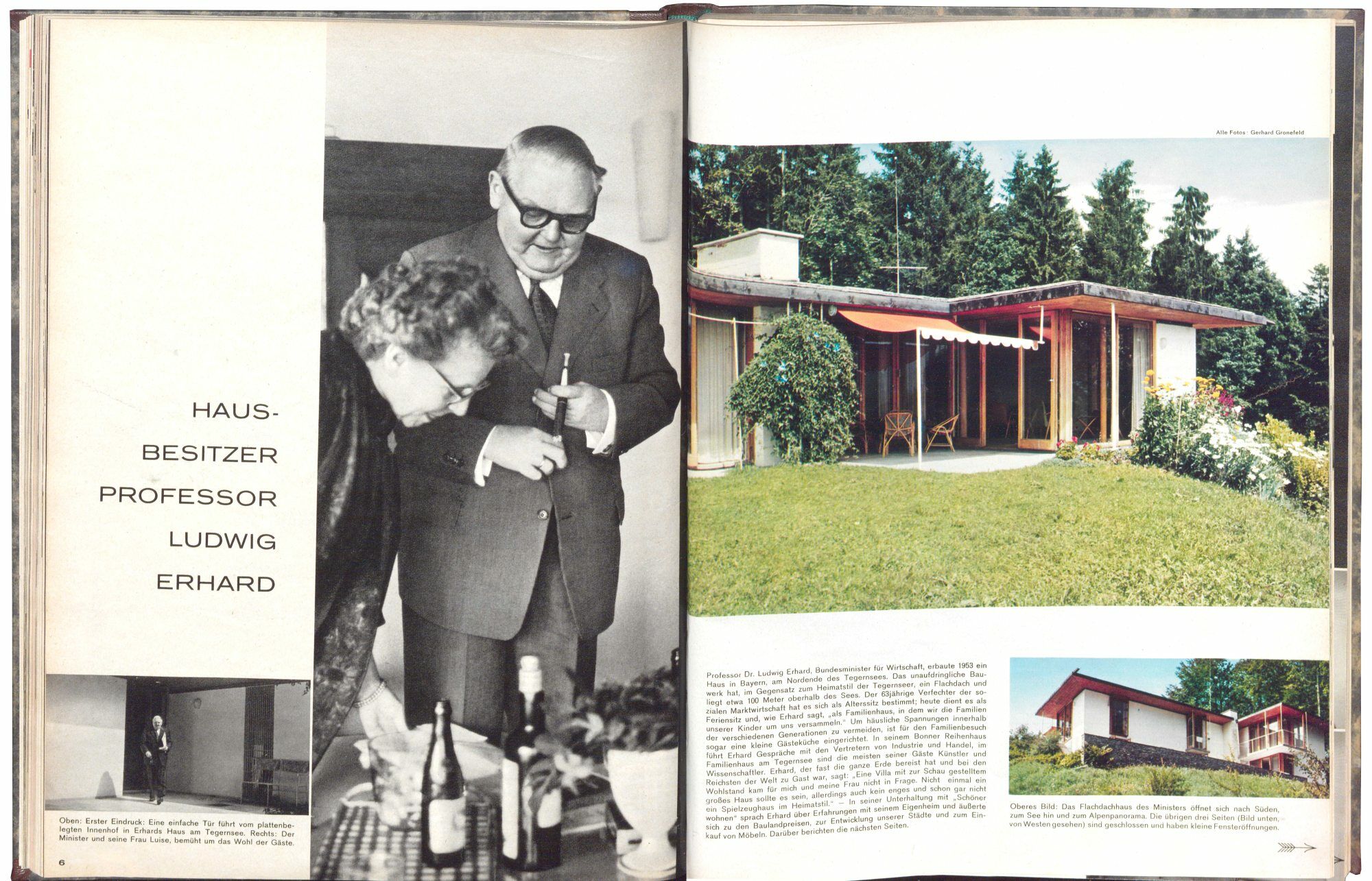 Wie sehr die Regierung unter Bundeskanzler Konrad Adenauer (CDU) den Traum vom Einfamilienhaus als politisches Instrument konservativer Zielsetzungen verwendete, zeigt Engelke mittels Beiträgen wie dem im Februar 1960 veröffentlichten Besuch bei „Hausbesitzer Professor Ludwig Erhard“. Auf fünf Doppelseiten und anhand von dreißig Fotografien konnte sich der damalige Wirtschaftsminister und spätere Bundeskanzler vor dem Hintergrund seines 1955 gebauten Ferienhauses nahe des Tegernsees in Szene setzen. Als guter Gastgeber, als beschäftigter Verantwortungsträger oder als Kenner der Baukunst, vertieft im Gespräch mit Architekt Sep Ruf.