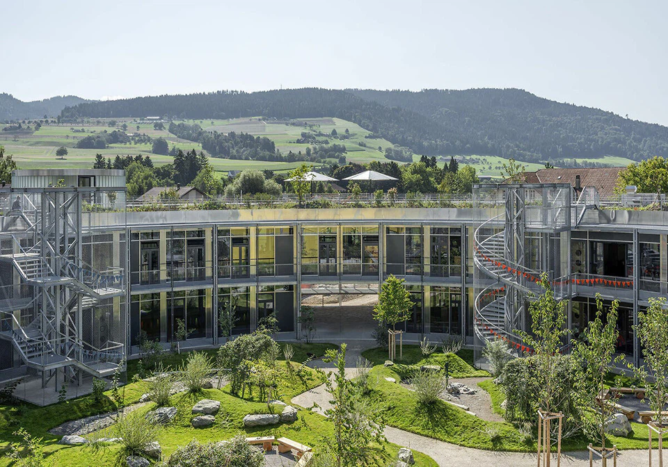 Apple hat sein rundes Spaceship von Norman Foster und die Gemeinde Konolfingen seit kurzem ein ringförmiges Schulhaus von Ernst Niklaus Fausch. Das Zürcher Büro belegte 2018 in einem Studienauftrag den 1. Rang, die Eröffnung erfolgte im vergangenen Jahr. Die Außenraumgestaltung stammt von Klötzli Friedli Landschaftsarchitekten aus Bern.