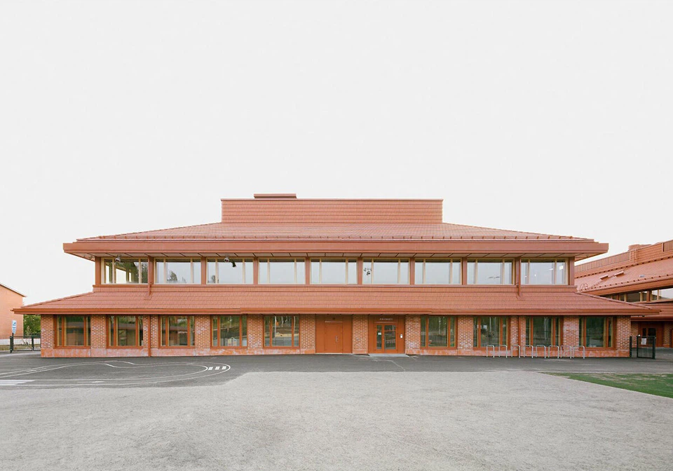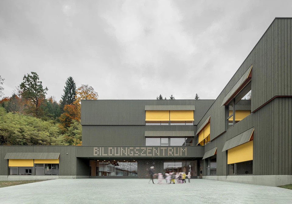 Der Neubau mit rund 8.400 Quadratmetern steht am südlichen Rand der kleinen Gemeinde im Kanton Bern. Die Anlage namens Schullandschaft Stalden umfasst drei Cluster à 8 Klassen und einen gemeinschaftlich genutzten Bereich mit Aula und Tagesbetreuung sowie Büros für die Administration. Auch Gruppenräume, Musikzimmer und Lehrerbereiche gibt es. Aufgrund der Topografie des Grundstücks variiert das Volumen zwischen einem und drei Geschossen. Rund 600 Schüler*innen der Primar- und der ersten Sekundarstufe werden unterrichtet.