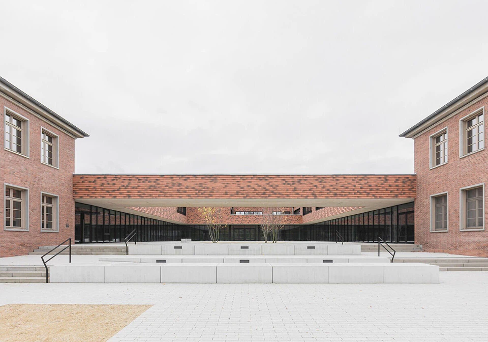 Zwei selbsttragende Laubengang-Schichten definieren den Übergang zum Außenraum. Die verschattbaren Stahlkonstruktionen verbinden auch alle Abschnitte des in vier Segmente – drei Cluster und der Gemeinschaftsbereich – unterteilten Grundrisses. Offene Treppenhäuser in unterschiedlichen geometrischen Grundformen dienen im Hof der inneren Adressbildung. Die Cluster verfügen über eine Mittelgangerschließung, immer wieder unterbrochen von offenen Lernbereichen. Multifunktionale Treppenskulpturen verbinden die Geschosse.