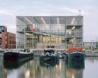 Der Logik des Masterplans folgt auch ein Detail des Projekts, das auf den ersten Blick nicht leicht zu erkennen ist. Weil ein öffentlicher Pfad über alle Streifen hinweg führen soll, musste dieser mittig in das Gebäude integriert werden. Der verläuft nun an der Nahstelle der beiden Gebäudeteile unter einem gläsernen Boden. Dieser schließt wiederum an eine große Freitreppe an, die vom Niveau des alten Hafendocks direkt in die Schule im 1. Stock führt. (sb)