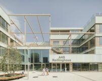 Während das Volumen zu den Straßenseiten kompakt auftritt, haben es die Architekt*innen in Richtung des südwestlich liegenden Schulhofs abgetreppt. Daraus resultiert eine Sequenz unterschiedlich hoher Dachgärten. Perspektivisch sollen hier Kletterpflanzen als Sonnenschutz heranwachsen und ein angenehmes Mikroklima schaffen. Auf der obersten Dachterrasse ist ebenfalls eine Sportnutzung vorgesehen. In der Fassadengestaltung dominiert die Farbe Grün in verschiedenen Abstufungen. (da)