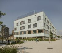 Die Erschließung erfolgt über die Aula und zwei Kerne, die alle Cluster und Departments verbinden. Die Grundkonstruktion besteht aus einem Betonskelett, Holzoberflächen und freundliche Pastellfarben bestimmen den Raumcharakter im Gebäudeinneren. Das Untergeschoss nimmt drei Turnhallen auf, die durch große Innenverglasungen von der Aula aus einsehbar sind. Ein zweiter, straßenseitiger Zugang ermöglicht eine externe Nutzung dieses Sportbereichs. Metallpaneele bilden die Fassade.
