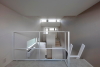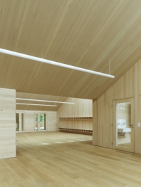 Vor allem: Innen bleibt dieser gefaltete Dachraum über den Klassenräumen offen, so dass der Blick hinauf wandern kann. Die lichte Raumhöhe steigt von 2,30 Meter auf fünf Meter unter dem First an. Für die Belichtung sorgen sowohl vergleichsweise kleine Fenster in den Außenwänden als auch große Oberlichtbänder, die jeweils nach Norden in die Dachflächen eingesetzt wurden und über die gesamte Gebäudebreite reichen. Ihre Entsprechung finden sie in Photovoltaik-Elementen, die jeweils an der gleichen Stelle auf der Südseite der Satteldächer angebracht wurden. Innen sorgen die unterschiedlichen Raumhöhen und wechselnden Lichtverhältnisse für eine abwechslungsreiche Atmosphäre. Die unterschiedlichen Räume lassen sich zudem für verschiedene Unterrichtsformen gruppieren.