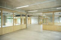 Der Neubau besteht aus drei kubischen Häusern mit geschosshohen, rund 400 Quadratmetern umfassenden sogenannten Lernlofts, in denen nun 380 Schüler*innen der Primar- und Sekundarstufe I und II in jeweils drei jahrgangsgemischten Gruppen lernen. Mauerwerk und Beton bleiben unbehandelt, Installationen werden offen geführt, Raumhöhe und -tiefe sind so proportioniert, dass – außer in der Mensa – eine natürliche Lüftung möglich ist. Statt mechanischem Sonnenschutz verschatten die Fenster umlaufende Balkone, die sogar betreten werden können.