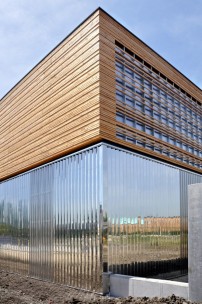 Doch nicht nur programmatisch brauchte die Schule ein Update. Auch die Fassade wurde hier erneuert. Ein neues Fassadenband aus perforiertem Edelstahl soll den gesamten Campus zusammenhalten und dem Schulbau ein neues Gesicht geben. Die kubenhaften Anbauten wurden mit Pappelholz verkleidet und erheben sich über den silbern glänzenden Zaun.