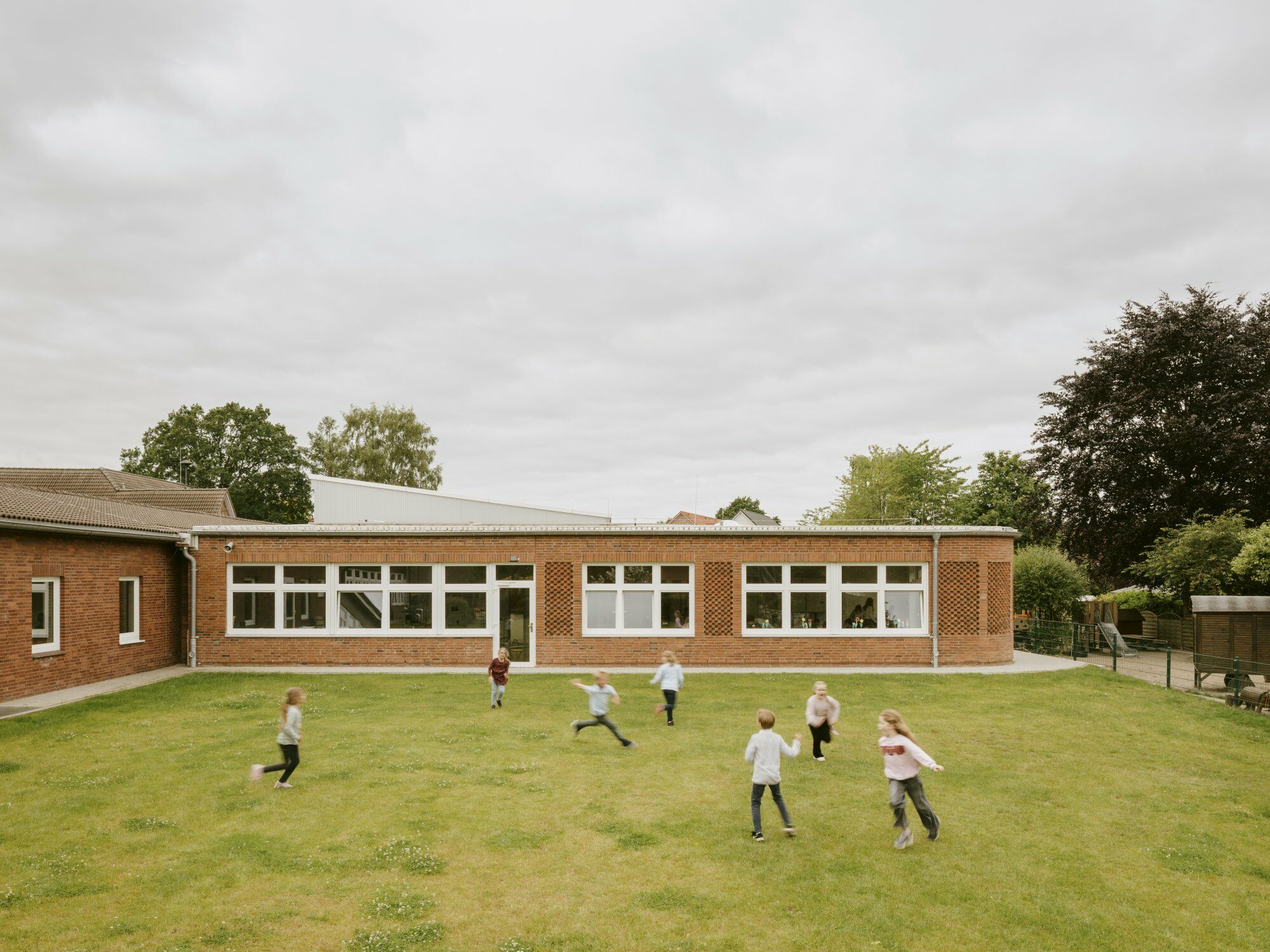 Vom Schulhof gesehen fällt die eingeschossige, gut 1.000 Quadratmeter große und an den Ecken abgerundete Ergänzung kaum als Neubau auf. Das Team um Jan Braker wählte für die Fassade des im letzten Jahr fertiggestellten Baus denselben Klinker, der schon im Bestand eingesetzt wurde.