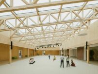 Innen überrascht der Raum hingegen mit zenitalem Lichteinfall und hellen Holzoberflächen. Schließlich handelt es sich auch konstruktiv um einen massiven Brettsperrholzbau. Das mit Fachwerkträgern überspannte und über ein Shed belichtete Atrium bildet das Herzstück des Entwurfs – hier erfolgt der Anschluss an den Bestand. Er fungiert außerdem als Pausenraum für die Kinder und kann außerhalb des Schulbetriebs als Versammlungsort genutzt werden. Auch bauphysikalisch profitiert der Raum vom Oberlicht: Dank Öffnungen entsteht ein Kamineffekt, der für natürlichen Luftaustausch sorgt. Ein ähnliches, lichtdurchflutetes Atrium mit Sheddach findet sich auch in der Kita in Lütjensee von Jan Braker Architekt. (tg)