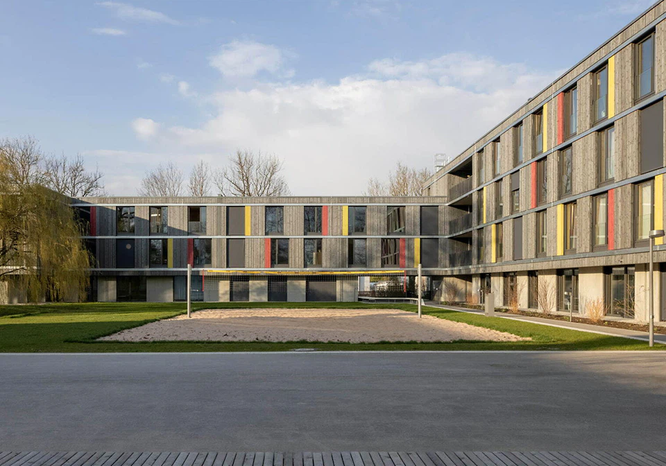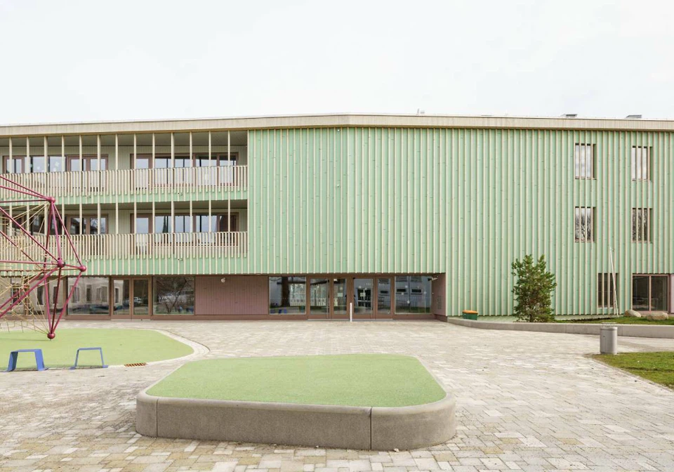 Der quaderförmige Baukörper mit einem Unter- und drei Obergeschossen wurde im Nordwesten des Schulgeländes an der Landschaftskante zu einem angrenzenden Park platziert. Er nimmt zwölf Klassenzimmer, eine Aula sowie weitere Unterrichts- und Funktionsräume auf. Wie die Architekt*innen mitteilen, sei es gelungen, die Erschließungsflächen fast vollständig als Aufenthaltsräume zu nutzen.