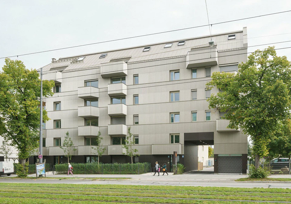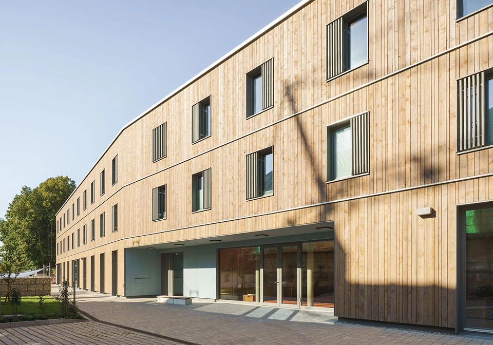 Die hinterlüftete Fassade der beiden Obergeschosse charakterisiert eine vertikale Boden-Deckel-Schalung, wobei man die Bodenschalung aus Tanne grün lasieren ließ. Im Kontrast dazu ist das Erdgeschoss mit mineralischen Werkstoffplatten verkleidet, um laut Architekt*innen Vandalismus standzuhalten. In den Innenräumen blieben die Oberflächen weitgehend unbeschichtet, um ein angenehmes Raumklima, eine warme Atmosphäre und eine gute Recyclingfähigkeit zu gewährleisten. (da)