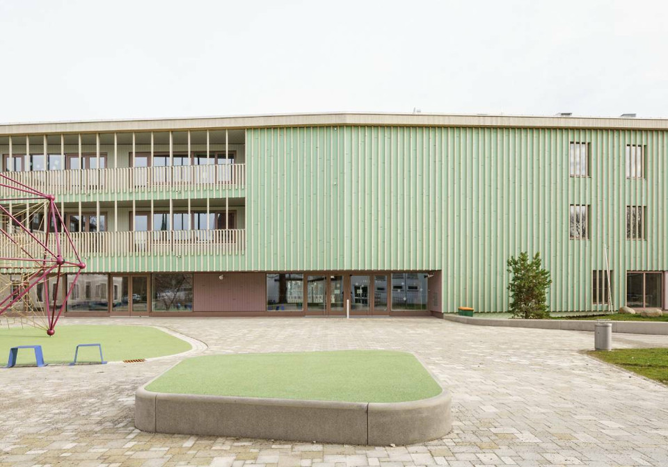 Der quaderförmige Baukörper mit einem Unter- und drei Obergeschossen wurde im Nordwesten des Schulgeländes an der Landschaftskante zu einem angrenzenden Park platziert. Er nimmt zwölf Klassenzimmer, eine Aula sowie weitere Unterrichts- und Funktionsräume auf. Wie die Architekt*innen mitteilen, sei es gelungen, die Erschließungsflächen fast vollständig als Aufenthaltsräume zu nutzen.