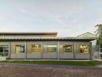 Nun wurde die zweizügige Grundschule im Rahmen einer Umstrukturierung zur Ganztagsschule und einer bevorstehenden Sanierung der Bestandsbauten räumlich erweitert. Zwischen März und September 2022 entstand ein neuer Baukörper in Holzmodulbauweise, der von Bauart Architekten (Zürich) in enger Zusammenarbeit mit dem Schweizer Holzbauunternehmen Blumer Lehmann (Gossau), das als Totalunternehmerin auftrat, geplant und umgesetzt wurde. Das Team, das bereits zahlreiche Holzmodul-Schulbauprojekte gemeinsam realisieren konnte, hatte im Vorfeld den ausgelobten Gesamtleistungswettbewerb gewonnen.