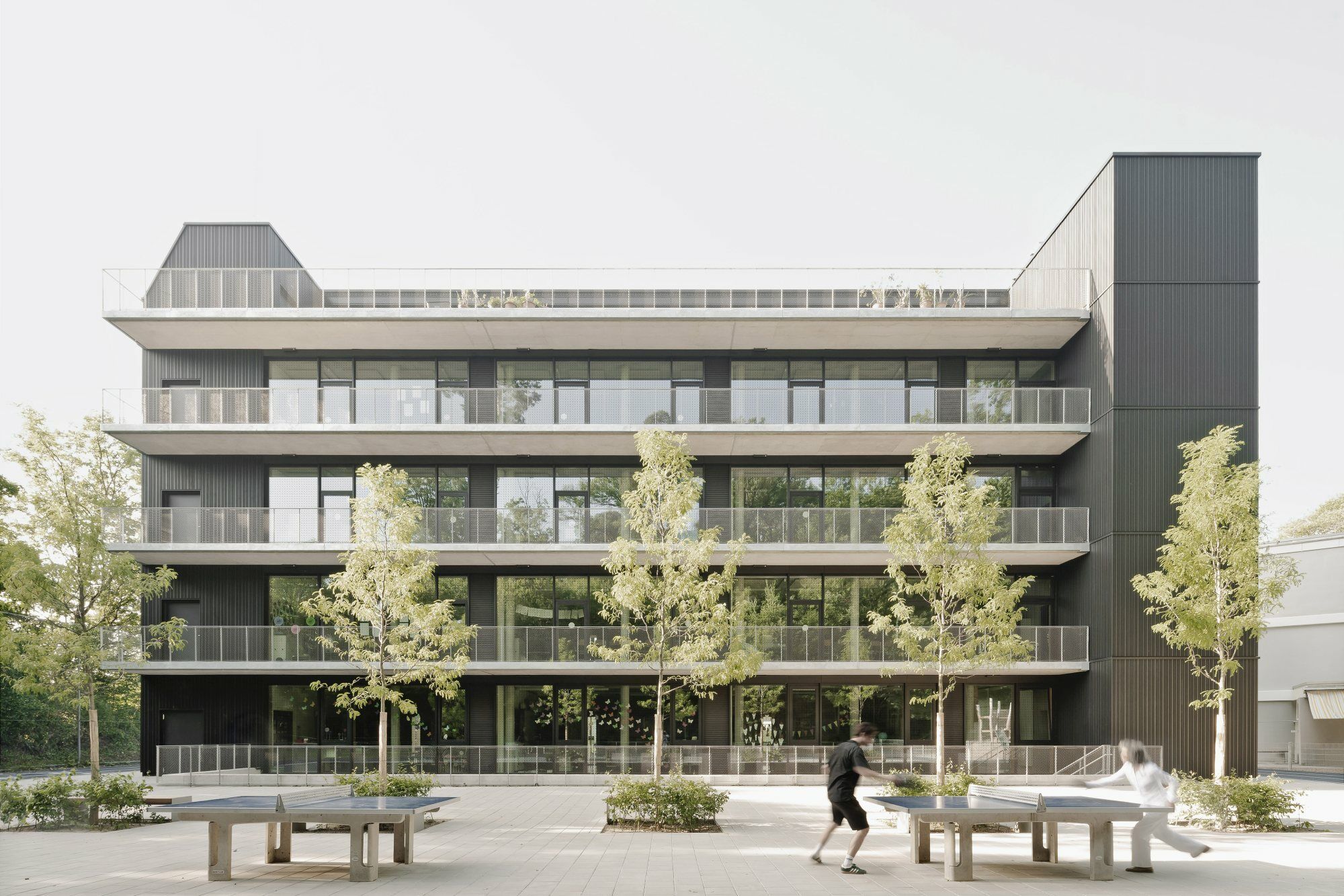 Zum Sportplatz hin zeigt sich das oberiridisch viereinhalbstöckige Gebäude mit einer gläsernen Front, während die Südseite regulär begehbare Fluchtbalkone prägen. Ein Verbindungssteg im ersten Obergeschoss schließt die Erweiterung an den Bestand an. Die ersten vier Stockwerke beherbergen Klassenzimmer. Diese sind zur ruhigeren Balkonseite orientiert. Ergänzende Fachräume brachten die Architekt*innen im Unter- sowie im Dachgeschoss unter. Letzteres wird über einen breiten Graben zumindest teilweise natürlich belichtet. Hinzu kommen Lehrerzimmer.