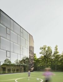 Nun hat sich in Form eines schlanken Erweiterungsbaus allerdings ein neuer Mitspieler aufs Feld begeben – und zwar mitten aufs Feld, denn die Laufbahn wurde außen herum geführt. Damit erhielt die Anlage einen deutlich urbaneren, verdichteten Charakter. Reichel Schlaier Architekten (Stuttgart) haben das Projekt entworfen. Die Außenraumgestaltung stammt von Gänßle + Hehr Landschaftsarchitekten (Esslingen).