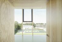 Ausgeführt ist das Haus als Stahlbetonskelettbau mit offener Grundstruktur, was spätere räumliche Anpassungen erlaubt. Der Beton der Decken bleib sichtbar und der übrige Ausbau erfolgte materialsichtig mit Holz und Linoleum. Die Sportplatzseite wurde als breite Erschießungs- und Begegnungszone ausformuliert. Ein multifunktionales Einbaumöbel bietet nicht nur Stauraum, sondern auch Platz für Waschbecken und Sitznischen.