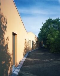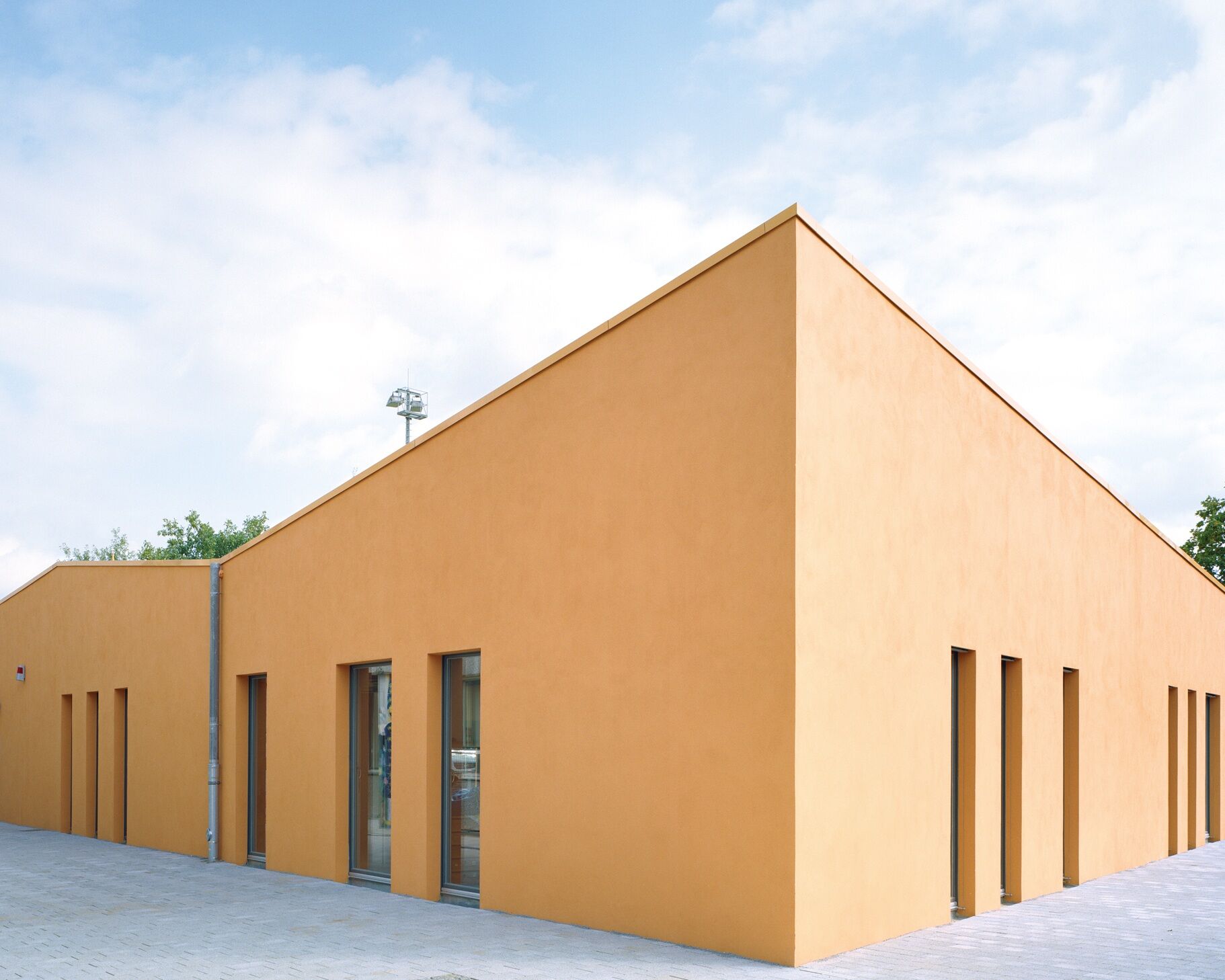 Die Architekten erläutern ihren Entwurf: „Der eingeschossige Neubau nimmt die Straßenflucht auf und erstreckt sich parallel zum Schulgebäude in die Tiefe des Grundstücks. Fassade und das gefaltete Dach werden gleich behandelt und konsequenterweise mit dem gleichen Material bekleidet. Der Baukörper erhält so einen skulpturalen Charakter.