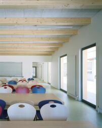 Die Schulmensa mit den notwendigen Serviceräumen ist zum Schulhof orientiert. Eine große raumhohe Fensteranlage schafft einen optimalen Außenbezug zur angrenzenden belichteten Terrasse.