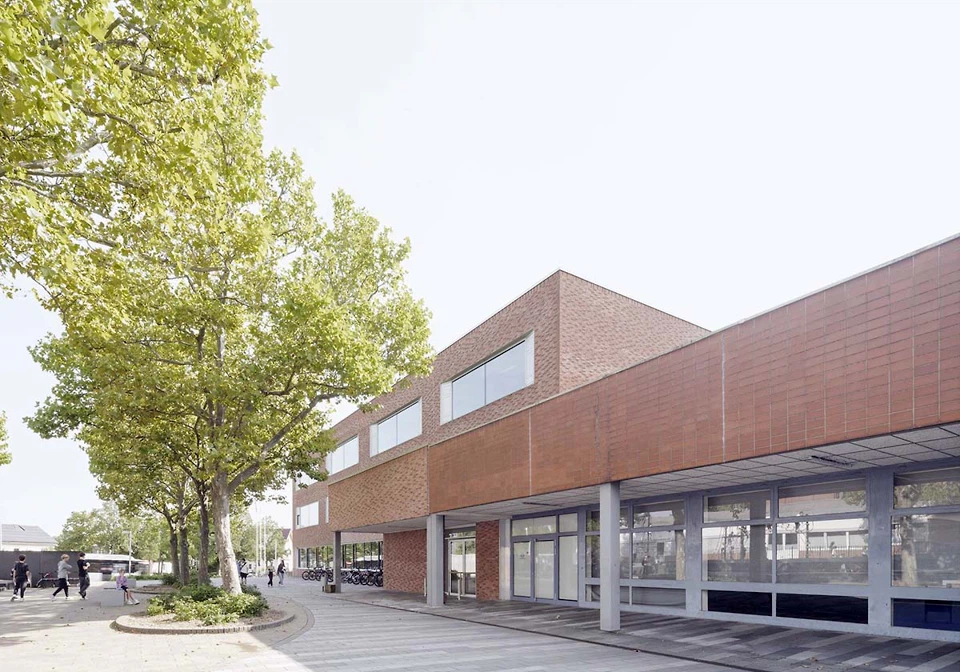 2019 gewannen MET den offenen Wettbewerb zur Gesamtsanierung der Anlage. Das Programm war ambitioniert. Neben der energetischen Ertüchtigung – inklusive Fernwärmeanschluss, vollständig erneuerter Elektroinfrastruktur und Photovoltaikanlagen auf nahezu allen Dächern – ging es um die Anpassung an aktuelle Gesetze und Normen ebenso wie um eine langfristige funktionale Ertüchtigung der Schule. Auffällig ist dabei der differenzierte und bedarfsgerechte Einsatz technischer Eingriffe. Während in der Gastroküche und den Sanitärbereichen mechanische Lüftungssysteme eingebaut wurden, erfolgt die Belüftung der Klassenzimmer und der Turnhalle überwiegend weiterhin manuell, ergänzt durch eine motorisierte Fensterlüftung zur Nachtauskühlung in den Klassenzimmern.