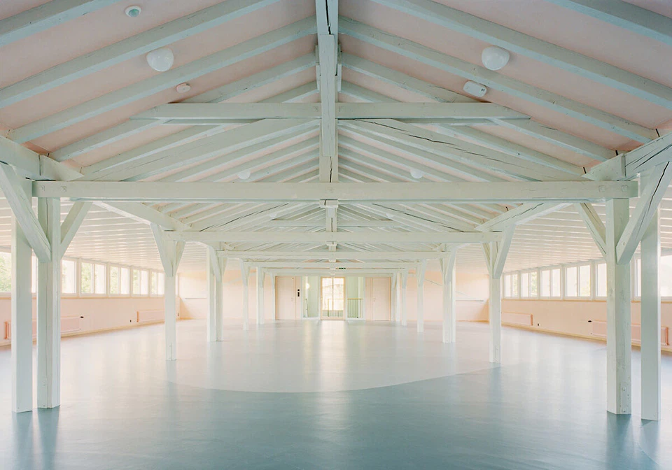 Auch in den übrigen Gebäuden blieb man der Strategie kleiner, gezielter Maßnahmen treu. Im nördlichen, flacheren Schulbau etwa wurde das zuvor lediglich als Lager genutzte Dachgeschoss durch beidseitige Schleppgauben belichtet und damit sinnvoll nutzbar gemacht. Heute dient der Raum der Ganztagsbetreuung – inklusive sichtbar belassenem Dachtragwerk. Ergänzt wurden ein Fluchttreppenhaus sowie ein Aufzug. Im Turnhallentrakt wiederum entfernte man die trennende Mittelwand der Nebenräume, sodass nun ein gemeinsamer Zugang zu beiden Hallen besteht. Eine neue Wandverkleidung integriert die Haustechnik und verbessert zugleich die Raumakustik.
