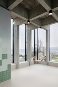 Die nämlich muss als durch und durch gelungen gelten, auch wenn die grünen Kachelvariationen, die an das Eintauchen in einen schattigen, klaren See erinnern sollen, sicherlich nicht jedermanns Sache sind. Denn wie die massive Betonkassettendecke in die schottenartigen Stützen übergeht, das ist von innen wie von außen sehr schön anzusehen. Tagsüber erinnert das dunkel spiegelnde Glasvolumen dabei entfernt an Gordon Bunshafts Erweiterung der Albright-Knox Gallery in Buffalo – während nach Einbruch der Dunkelheit dann die fast schon klassizistisch anmutende Betonstruktur deutlich hervortritt. Die Architektinnen sprechen von einem kontrastreichen Spiel mit Leichtigkeit und Massivität.