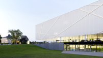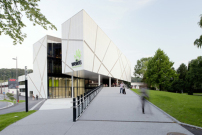 Eine weiß schimmernde Streckmetallfassade überzieht den gesamten Baukörper als homogene Hülle. Glaswände bleiben auf die „aufgerissenen“ Einschnitte beschränkt. Glasbänder mit integrierten Photovoltaik-Elementen zeichnen ein Linienraster auf der Fassade – die „Energielinien“. Integrierte LED-Lichtleisten ermöglichen eine variable Bespielung der Fassade und geben dem Gebäudekomplex die Erscheinung eines Science-Centers.