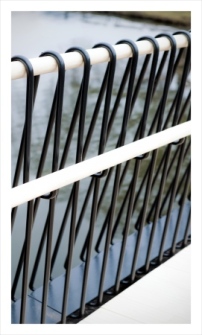 Das charakteristische Element ist die Brüstung, die sich wie ein durchlaufender Wollfaden – daher der Name – in Bögen über den Handlauf legt. Der Stahlfaden bildet dabei ein Netz mit unterschiedlich weiten Maschen.