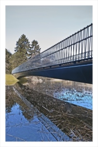 Der Schlüsselgedanke des Entwurfs war, die Brücke einerseits in die Landschaft einzufügen, andererseits sollte sie einen eigenständigen Charakter erhalten. Sie bildet durch die unterschiedlich hohen Seeufer einen leicht gekippten Bogen. Die Fundamente sind unter der Stahlkonstruktion versteckt, um einen weichen Übergang zwischen Bauwerk und Natur zu schaffen.