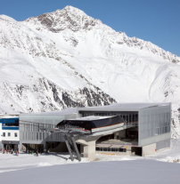Auch wenn natürlicher Schnee mittlerweile nicht einmal mehr in den Alpen selbstverständlich ist – das Skigebiet am Stubaier Gletscher in Tirol wirbt mit einer Schneegarantie von Oktober bis Juni und zieht damit scharenweise Wintersportler an. Um diese so bequem wie möglich auf die in über 2300 Metern Höhe liegenden Pisten zu bringen, verfügt das Areal über zahlreiche Seilbahnen und Skilifte, und man setzt auch hier auf den Superlativ: Die zu Beginn der aktuellen Wintersportsaison in Betrieb gegangene 3S Eisgratbahn ist mit einer Länge von 4,7 Kilometern die derzeit längste Dreiseil-Umlaufbahn der Alpen. Ihre Stationsgebäude aus Sichtbeton und Profilglas stammen vom Innsbrucker Büro ao-architekten.