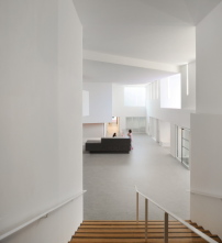 Die Architekten schneiden zwei offene Höfe in das Gebäude hinein. Diese belichten zunächst die Innenräume des breiten Komplexes. Doch Dominique Coulon hat die Erschließungswege und Treppenhäuser um die Höfe herum als einen Parcours angelegt, der mit einem warmen Farbanstrich zugleich zu einem einladenden Kommunikationsort wird. Von einem leichten Rosa bis zu einem kräftigen Rot changiert die Farbgestaltung. Es soll schließlich nicht nur schwarz-weiß gemalt werden. (sj)