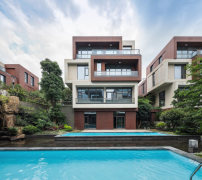 Was ähnlich simpel wie bei Bjarke aussieht, erwies sich sicher als infrastrukturelle Herausforderung. Gemäß der Entwurfsmaxime, möglichst viele der 70 drei- bis viergeschossigen Villen und Townhouses zum Wasser zu orientieren, wurden zahlreiche künstliche Kanäle geschaffen und mit dem Fluss verbunden, die Topographie der Lianjiang Butterfly Bay manipuliert. Neben den Kanälen, die nicht tiefer als 20 Zentimeter sind, befinden sich zu beiden Seiten der einzelnen Villen zusätzlich Pools.