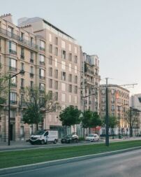 In Paris konnten MARS nicht das ganze Grundstück bebauen, sondern mussten Mindestabstände zu drei vorhandenen Fenstern am Hof einhalten. Die vorgeschriebenen Abstandsflächen vergrößerten und verbanden die Architekt*innen gezielt, und ließen zum östlichen Nachbarn noch eine zusätzliche Lücke. In dieser Fuge liegt der Eingang zum Neubau hinter einem Metalltor. Die zusätzlichen Abstände sorgen dafür, dass fast jede Wohnung im Neubau Licht von zwei Seiten erhält. Über dem Sockel kragt die Fassade zur Straße hin mit einem leichten Schwung nach außen – was durch eine Verspiegelung auf der Unterseite dieser Kante noch elegant betont wird.