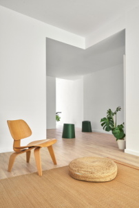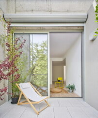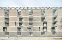 Im Inneren der insgesamt 54 Wohnungen schafft die Positionierung des Badezimmers in der Mitte des Grundrisses eine kreisförmige Zirkulation, die die Wohnung größer erscheinen lässt. Die Verkleidung der Betonstruktur mit Sichtmauerwerk, das als Material in der Planung vorgeschrieben war, bot die Chance, mit Gitterstrukturen zu arbeiten. Diese verleihen dem Gebäude eine poröse Textur und ermöglichen eine natürliche Belüftung von Treppen und Parkhaus im Untergeschoss. Eine der beiden Längsfassaden ist durch ein freitragendes Balkonsystem aus Metall charakterisiert, das die Bewohner*innen zur Begrünung animieren soll. (da)