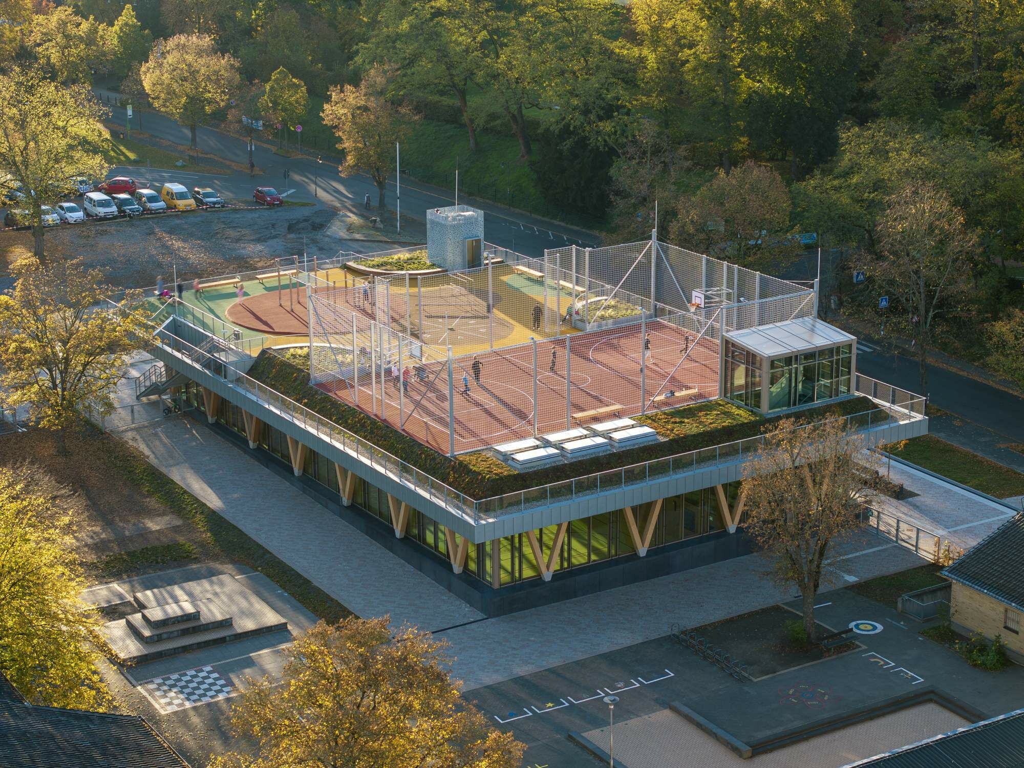 Die Kölner Architekt*innen verlegten das Sportfeld der Halle in das Untergeschoss und arbeiteten mit raumhohen Glasflächen, V-Stützen aus Holz und einem weiten Dachüberstand. Das Ergebnis ist ein städtebaulich angemessen zurückhaltender Baukörper, der elegante Transparenz und sinnfällige Holzkonstruktion überzeugend kombiniert.