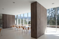 Unterrichtsräume sind in einem angehobenen weißen Volumen untergebracht. Die horizontalen Fensterbänder betonen dessen Länge. Durch diese Öffnungen wird der Blick in das Grün ringsum eingefasst. Um die zentrale Treppe gibt es keine Öffnung nach Außen – dort ist das kontemplative Weiß des Innenraums durch indirektes Licht inszeniert. Die natürlichen Farbtöne der ausgewählten Materialien und Oberflächen von Putz und Waschbeton bis zu Granit und Holz unterstützen die klassisch-moderne Anmutung des Entwurfs.